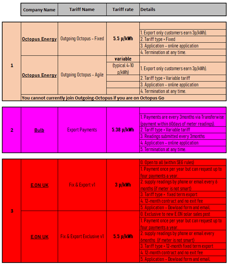 | Octopus Energy | Outgoing Octopus – Agile | variable (typical 4-10 p/kWh) | 1. Export only customers earn 3p/kWh). 2. Tariff type = Variable tariff 3. Application – online application 4. Termination at any time. |
