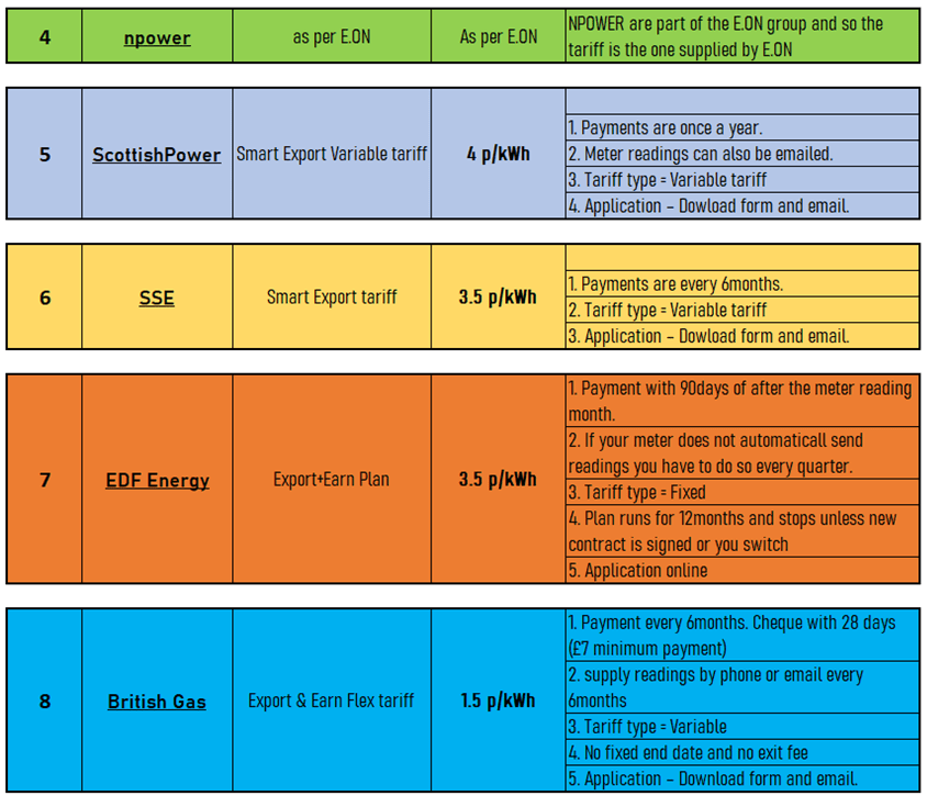 | SSE | Smart Export tariff | 3.5 p/kWh | 1. Payments are every 6months. 2. Tariff type = Variable tariff 3. Application – Dowload form and email. |